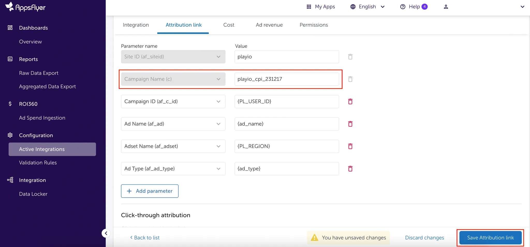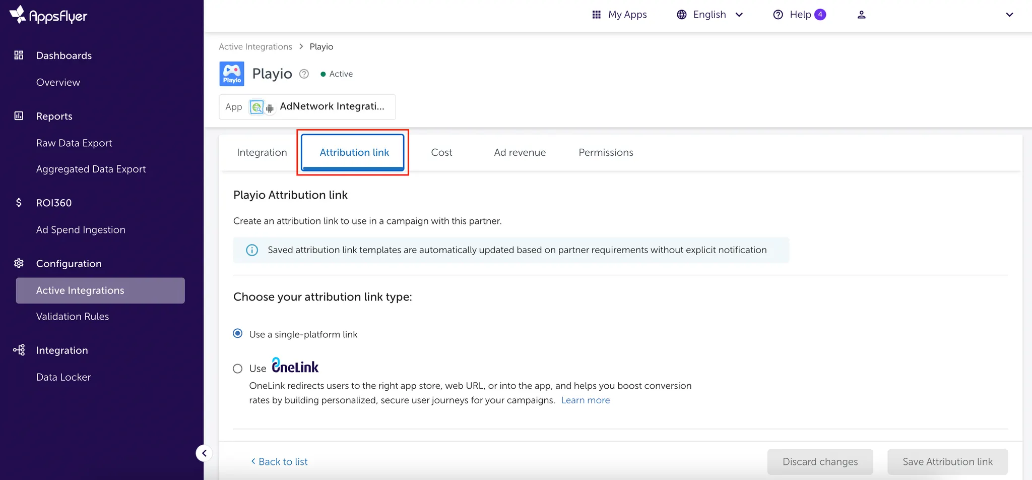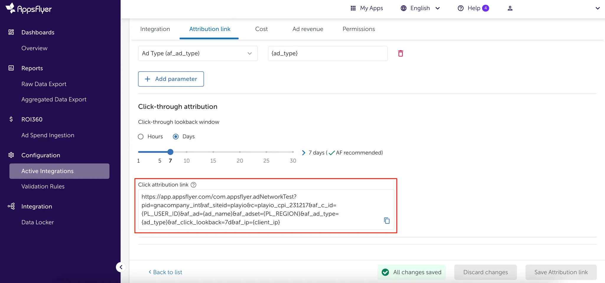 Configuration > Active Integrations > Attribution link를 클릭해주세요.