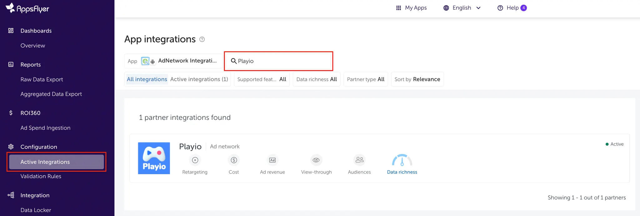 연동을 원하는 앱을 클릭 후 Configuration > Active Integrations 에서 Playio를 검색해주세요.