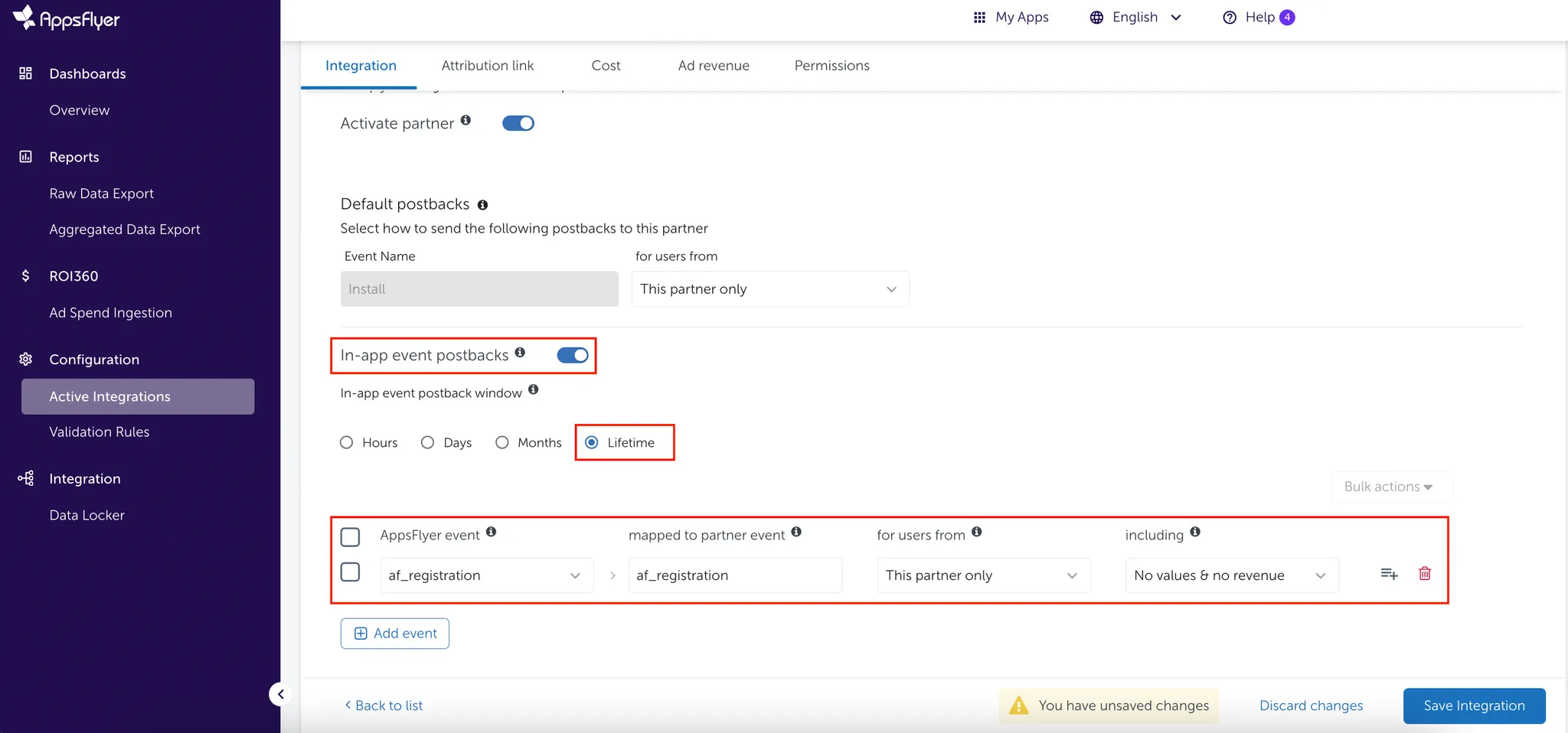 인앱 이벤트 포스트백을 설정 후 ‘Save Integration’을 클릭해주세요.