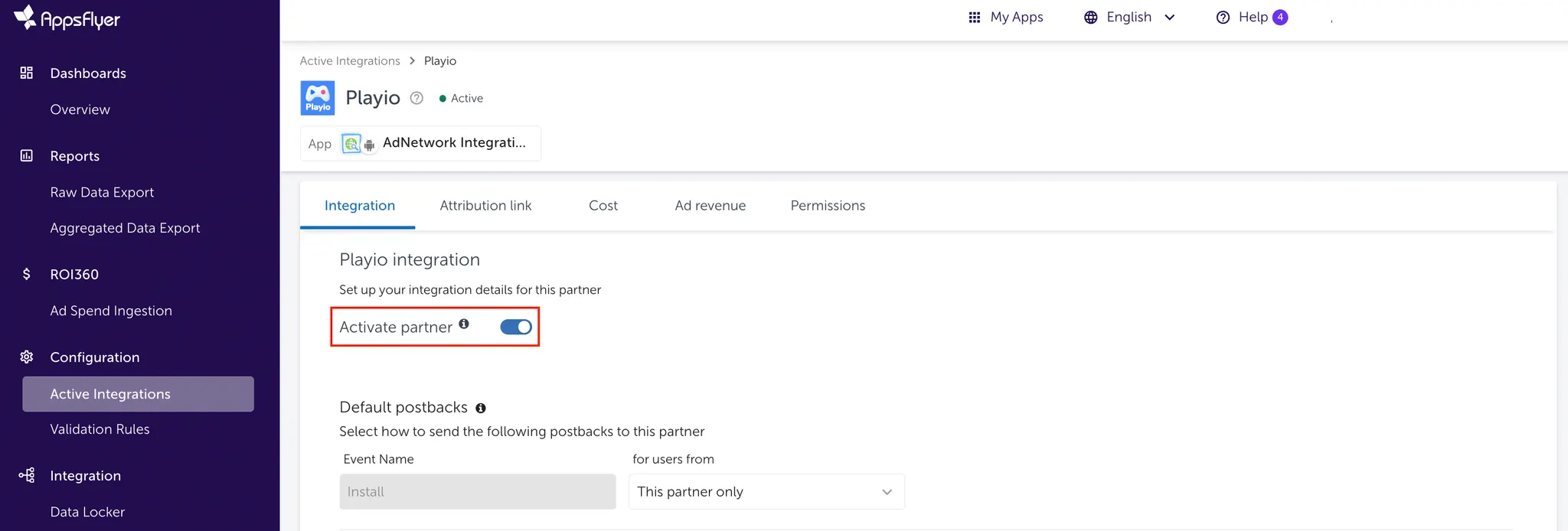 Activate partner 토글을 켜서 플레이오로 데이터 전송을 시작해주세요.