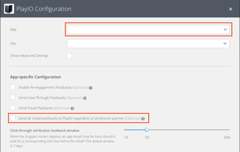 [APP] 선택한 후 인스톨에 대한 데이터를 확인하기 위해 [Send all install postbacks to PlayIO regardless of attribution partner]에 체크해주세요.