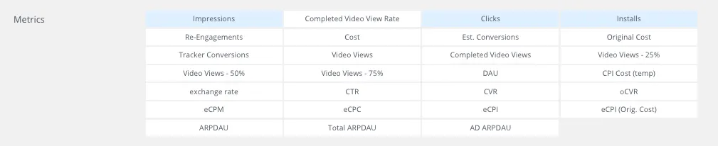 아래 설정 영역 중 [Metrics]에서 Impressions, Clicks, Installs 을 선택해주세요.