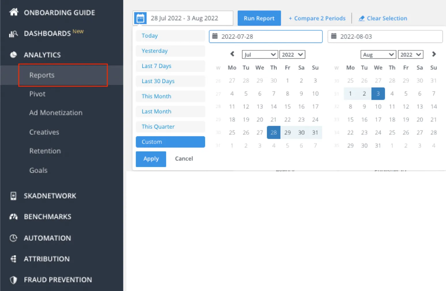 ANALYTICS > [Reports] 메뉴에서 플레이오 마케팅 기간을 설정해주세요.