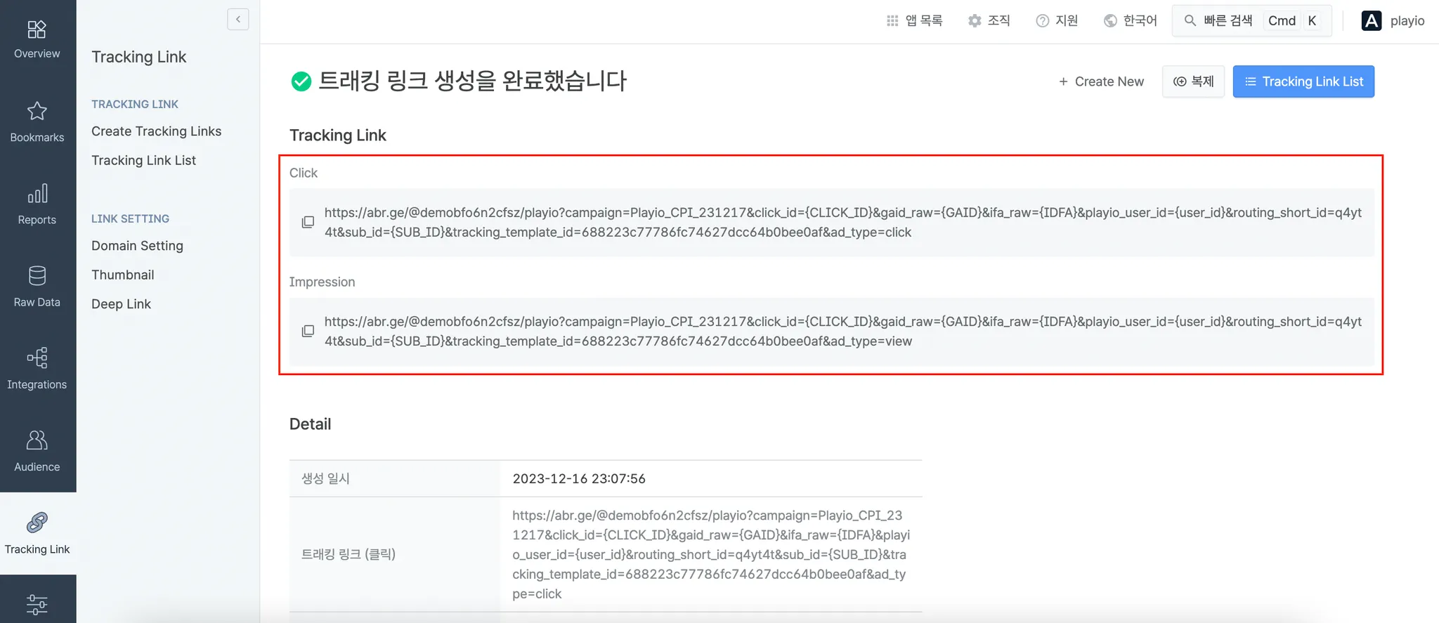 [Ad Channel Integration] > [플레이오] > [트래킹 링크] > [트래킹 링크 생성]을 클릭해주세요.