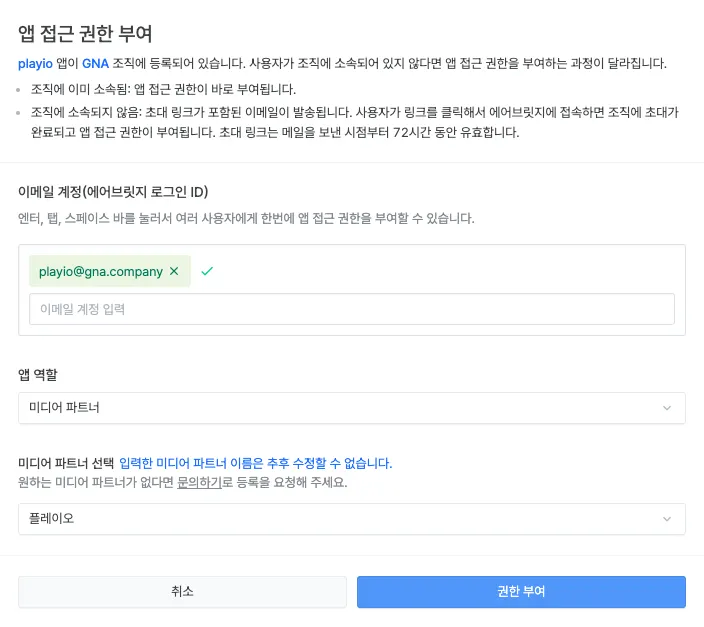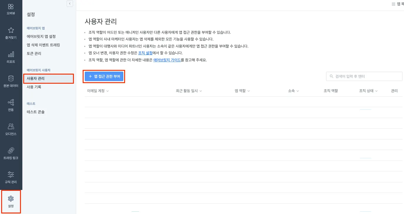 [설정] > [사용자 관리] > [앱 접근 권한 부여]를 클릭해주세요.
